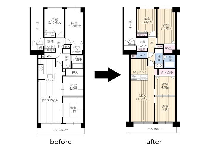 85㎡の広さを活かし、あえて間取りはそのままに、リビング横の洋室は陽光がいき渡るのでお子様部屋として使っていただくイメージです。設備はスタイリッシュで機能的、建具やフローリングは自然なぬくもりを感じられます。
